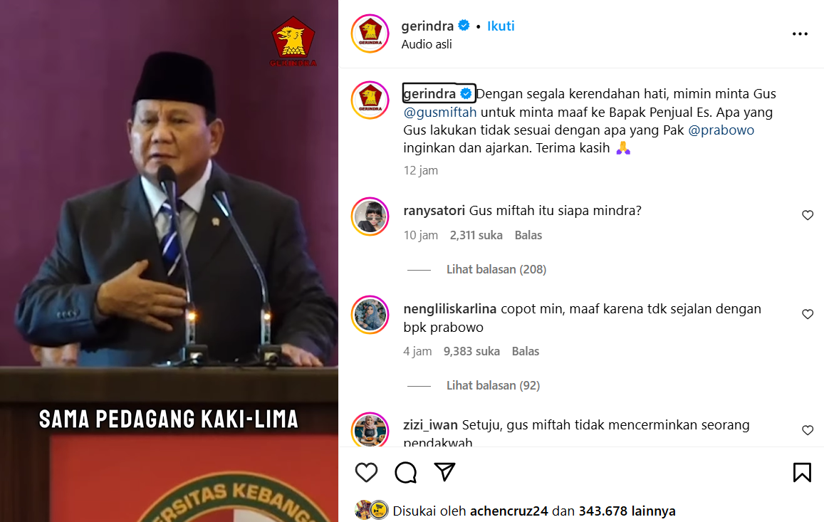 “Apa yang Gus [Miftah] lakukan tidak sesuai dengan apa yang Pak @prabowo inginkan dan ajarkan. Terima kasih,” tulis Instagram @gerindra, Selasa (3/12/2024) malam.