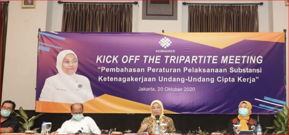 "Kami menyiapkan empat RPP sebagai turunan dari UU Cipta Kerja. Kalau di UU Cipta Kerja itu kan kita punya waktu tiga bulan, tapi lebih cepat kan lebih baik," kata Menaker Ida saat menyampaikan sambutan pada Kick-Off the Tripartite Meeting “Pembahasan Peraturan Pelaksana Susbtansi Ketenagakerjaan Undang-Udang Cipta Kerja” di Jakarta, hari Selasa (20/10/2020).