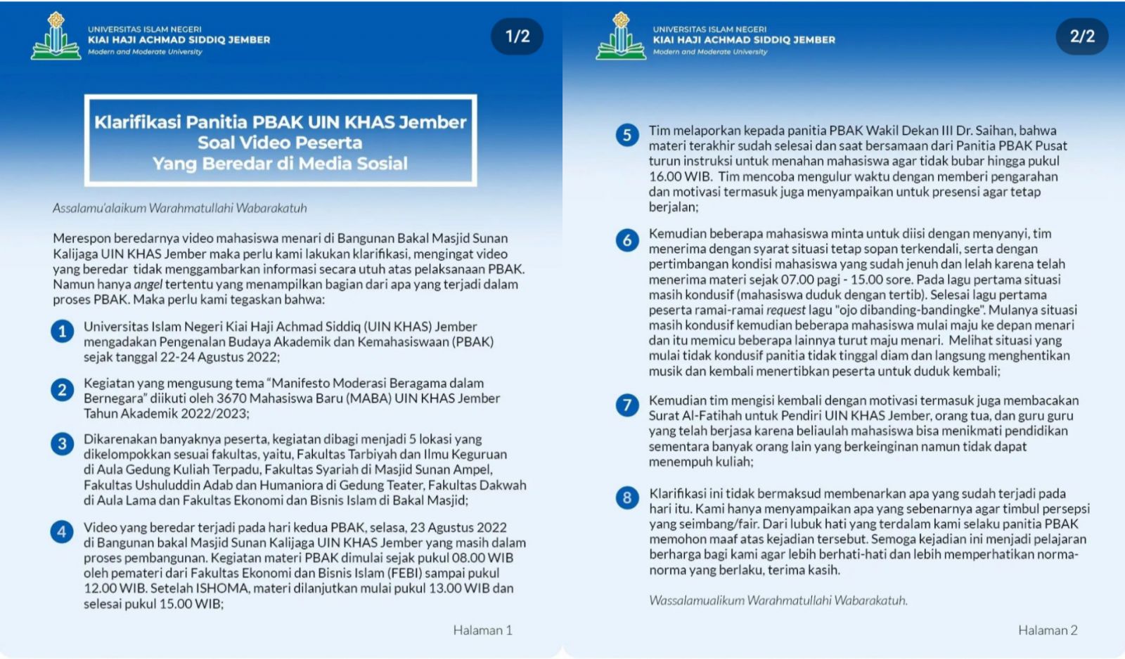 “Merespon beredarnya video mahasiswa menari di Bangunan Bakal Masjid Sunan Kalijaga UIN KHAS Jember maka perlu kami lakukan klarifikasi, mengingat video yang beredar tidak menggambarkan informasi secara utuh atas pelaksanaan PBAK,” tulis akun Instagram resmi UIN KHAS @uinkhasjemberofficial.